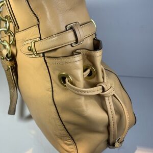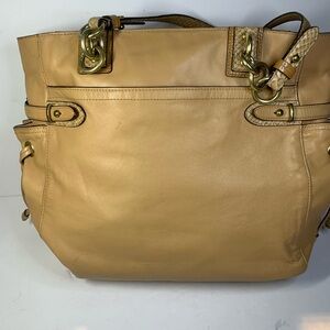 Coach Madison tote in beige leather. Features gold accents. Ideal for everyday style.