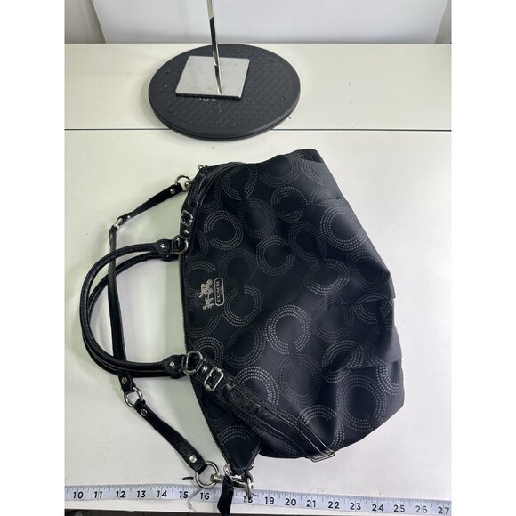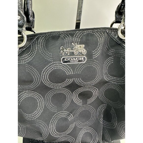 The Coach Madison Dotted Op Art Large Sophia Satchel is a stylish and spacious shoulder bag designed for women. Featuring a black exterior with white dots in a logo pattern, this bag combines a modern design with classic elements. The satchel is made of a textile and leather blend, with a zip closure and chrome hardware accents. The bag includes a white leather handle/strap for easy carrying, a black lining, and a signature Coach Madison Dotted Op Art design. This chic and eye-catching handbag is perfect for adding a touch of artistry to any outfit.