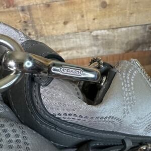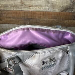 Coach Madison Dotted Op Art Sophia Satchel. Style# 15935. Color ~ Silver/gray. Signature OP ART fabric with leather trim. Top zip closure. Handles and longer detachable strap. Two Coach hangtags. Silver hardware with Coach logo. One inside zip and two open pockets. Purple lining. Excellent condition but there are a few marks on the lining and the top of the lining by the zipper has a dark area. See pics.