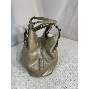 Coach Madison Maggie GOLD Patent Leather Shoulder HOBO Bag K1169-18760. There are some spots, ink marks, and some missing material - please see all pictures. These imperfections are not visible at a glance. Overall, it looks very nice. Approximate measurements: 14" long x 8" tall x 5" deep.
