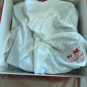 Black canvas Coach shoulder bag with white op art signature Coach design, leather patches and shoulder strap, silky blue interior, used but in great condition, comes with Coach dust bag