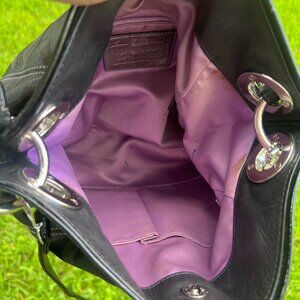 The Coach Madison Op Art Signature C Purse Bag is a vintage Y2K women's handbag featuring a black exterior with a purple lining. This crossbody style bag is made of canvas with leather handles/straps, perfect for adding a touch of art-inspired flair to any outfit. The Coach Madison Op design combines artistic elements with classic black and purple tones, making it a stylish and timeless accessory for any woman's wardrobe.