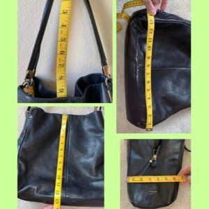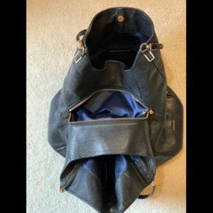 Black pebbled, supple leather, navy blue fabric lining, fixed double straps, brass tone hardware, inside zip, cell phone and multifunction pockets. Nice condition, gently used - See Photos for wear, some scratching on hardware.