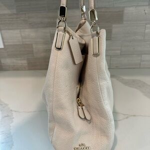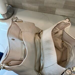 Chic cream leather handbag with gold-tone hardware. Perfect for any occasion.