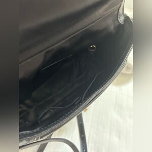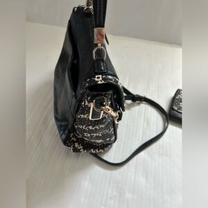 This Coach satchel features a sophisticated black and white design, crafted from premium leather with a glossy finish. The bag has a two hang tags and a distinctive front flap with a turnlock closure, making it a versatile accessory for any occasion.
