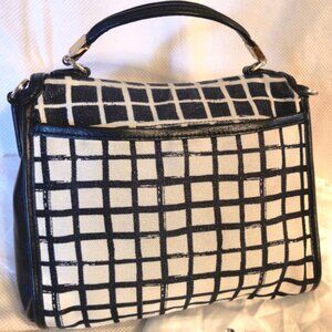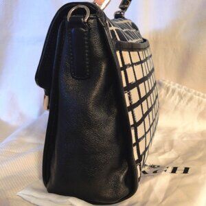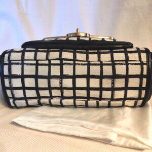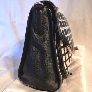 Exterior features checked graphic print canvas fabric with soft black leather trim and side panels, light gold hardware, turnlock closure, back slip pocket, top leather handle w/3.5" drop, black leather hangtag w/gold metal tag charm, and removable/adjustable black leather crossbody strap with 21.5" drop. Interior features slip pocket under flap, and fully lined black silky fabric main compartment w/zip pocket and two slip pockets opposite side. Ships in Logo Dust Bag.