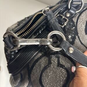 Gorgeous and rare Coach Madison Sophia satchel featuring the iconic Sequin Op Art C pattern, black leather trim, and gunmetal hardware. This is the medium Sophia size with rolled leather handles and a detachable long strap. Stunning sparkle and true Y2K glam energy.