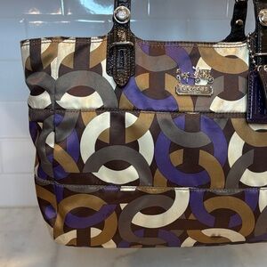 Authentic Coach Madison Tribeca Scarf Print Sateen Op Art Signature Tote. A stylish and versatile handbag perfect for adding a touch of designer elegance to any outfit. Crafted from signature multicolored scarf print sateen fabric in a captivating purple, gold, and brown chainlink pattern, this tote is accented with rich brown leather trim and polished silver-tone hardware, including eye-catching chainlink details on the shoulder straps. The spacious interior offers ample room for your essentials, while the magnetic snap closure keeps your belongings secure.