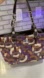Stylish Coach tote with bold purple and brown pattern. Features signature design and chain handles. Callout some small pen marks on inside of side pocket see photo.Perfect for everyday use.