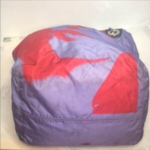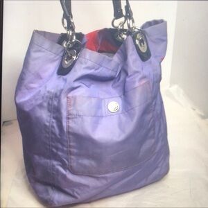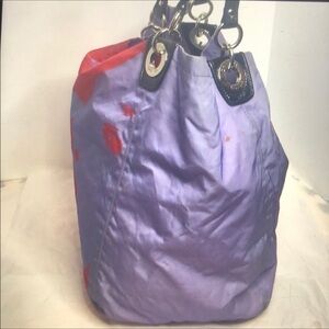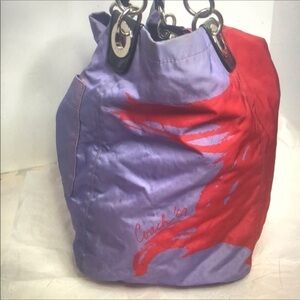 Handcrafted with water&stain resistant luxurious top quality nylon fabric in stunning red& purple combination accented with leather trim and studs absolutely wow! Bag is beautifully detailed with a girls face in true coach fashion, This is part of Madison collection limited edition from 09 this is really pretty light & handy overall bag is still in great shape with lots of life left in it a true collectors piece 13”H x14”W x 9”D strap prop 8”