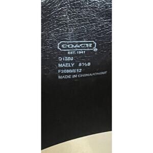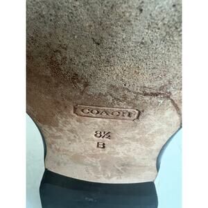 These are a pair of women's knee-high riding boots from Coach, they have a classic fit. The boots are made from a soft, black leather with a smooth finish,