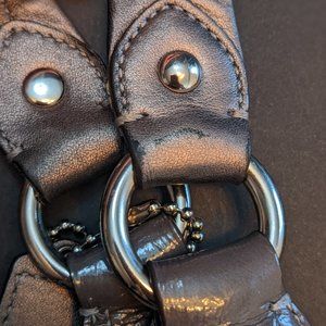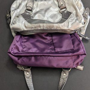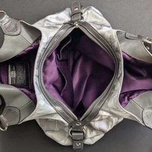This is an Authentic Coach Maggie Signature Madison Op Art Lurex Style 14426. This Coach purse is grey, with silver stitching, and purple liner. This is a hobo style bag with three separate compartments with multiple pockets. Middle compartment can be zipped and left and right side compartments have magnetic closures. This purse is used but still in good condition with a lot of life left. I did my best to have all the imperfections pictured above and please don't be afraid to ask for more pictures if there is something else you would like to see. Overall first looks at the purse it looks new, as you get closer you will see general wear from use on the purse, I also recently took it to the dry cleaners for a clean-up, and has been in a plastic dust bag ever since. I just don't use bags this big anymore and don't foresee myself in the future either, so it's time for a new home.