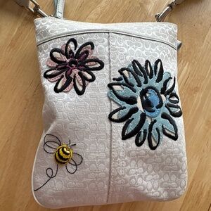 Pick in color with beautiful flowers on it. It is a vinyl texture with tags.