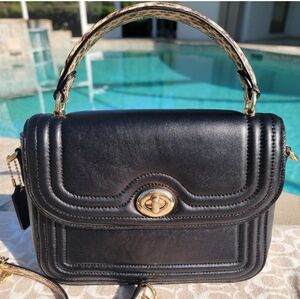Beautiful Coach black leather Marlie top handle satchel/crossbody with border quilting and snakeskin top handle accented with gold hardware. This beauty is almost flawless and in excellent pre owned condition. One very small bubble in the front( which is pictured but hard to see). I always disclose any flaws. This one is barely visible. Spotless interior, 1 zip pocket, 1 large slip pocket. This bag also has an outer pocket on the back for extra storage. This one is a beauty.