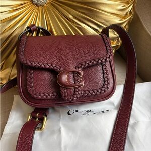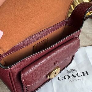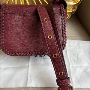 Chic Coach crossbody in maroon leather. Features braided detailing and signature clasp. Ideal for versatile wear.