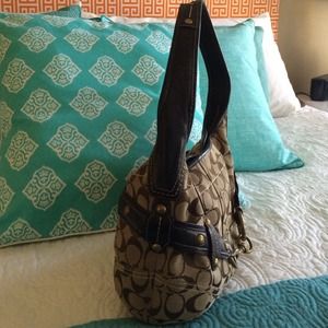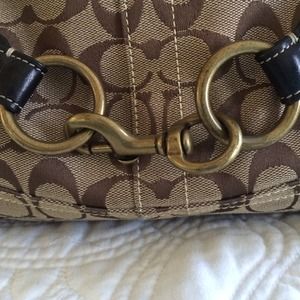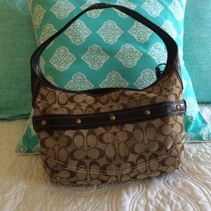 Tan and Brown Coach hobo bag in great condition! Brass buckle and hardware makes this bag super chic! Hardly used! No marks or stains! Kept hanging in closet!