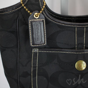 Gorgeous signature tote bag from Coach. It has black with black C's fabric with black leather piping and handle. It has brass hardware. It has a black sateen lining interior, with two slip pockets and a zippered pocket inside. It also has a pocket on the front with a magnetic snap closure.