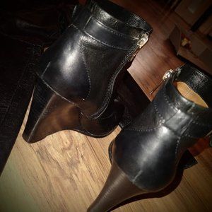 Super cute leather bootie. Thin signature buckled ankle strap adds elagance to these 4" wedged heel. They have an inner side zip closure and silver hardware. EXCELLENT condition