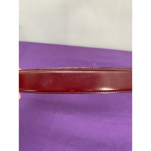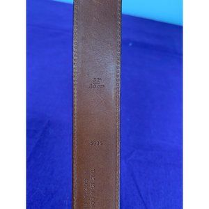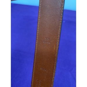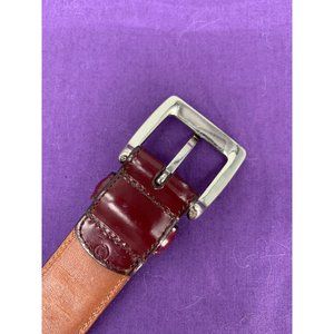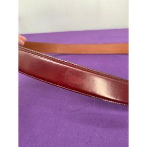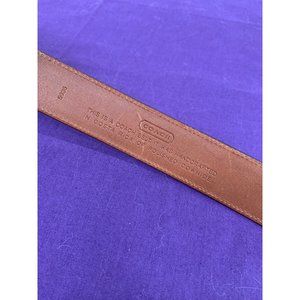 Handcrafted Coach belt made from polished cowhide in a reddish-brown color. The belt features a silver tone buckle and is 32 inches in length.