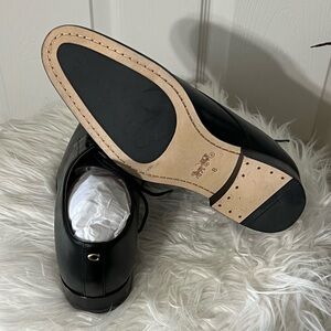 These are Coach men's black leather derby shoes in size US 8. They feature a solid pattern with a comfortable leather upper and insole. The outsole is also made of leather, making them durable and stylish. Gold “C” on the heels