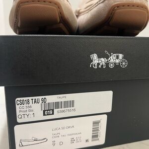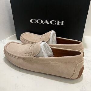 Stylish Coach loafers in light tan suede. Perfect for any occasion. Comfortable and elegant design.