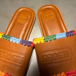 These Coach sandals showcase a rich brown leather design accented by a vibrant red and multicolored braided trim, offering a playful bohemian touch. The embossed Coach logo on the strap adds a touch of elegance, while the molded footbed ensures comfort for all-day wear. Ideal for a casual summer outing, these sandals effortlessly combine luxury with a relaxed style.