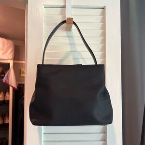 This Coach Mercer mini handbag is a stylish addition to any outfit. With a black leather and nylon soft brown coach logo embossed interior, this bag is both durable and fashionable. It has a top handle in black leather for easy carrying. Sides features leather accent strip. Base is full grain leather with an oversized Coach logo stamp. Closure is a large leather strap with a magnetic clasp. Interior features a center divider with a zipper pocket and a side pocket also zippered. Small but well designed.