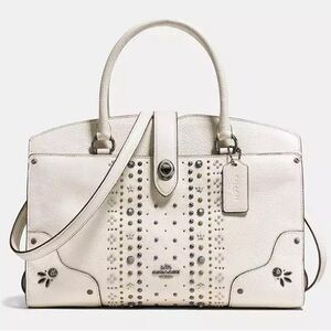 Coach Mercer Studded Bandana Rivets 2-Way Satchel 30. Gorgeous polished pebble leather with edgy mixed metal studded design on the front. Color is Chalk. Gunmetal gray hardware. Coach hang tag. Adjustable and removable long shoulder strap. Can be worn crossbody. Rolled leather handles. Belted turnlock closure. Spacious fabric interior with two separate compartments divided by a zippered pouch pocket.
