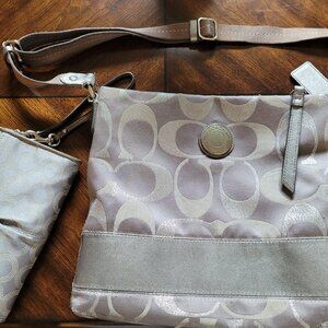 Coach Messenger bag is grey and silver design fabric 12" wide x 10" high and spacious inside with zipper and back pocket. The wristlet wallet has zipper top, front and back pockets. The inside has 8 credit card slots with 3 slots for bills.