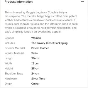 This shimmering Maggie bag from Coach is truly a masterpiece. The metallic beige bag is crafted from patent leather and features a crossover buckled strap closure. It flaunts dual shoulder straps and the interior is lined in satin which is spacious enough to hold all your necessities. The bag's simplicity lends it an everlasting appeal.