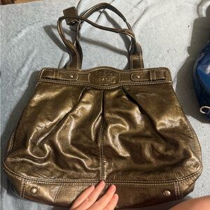 Chic metallic bronze design. Features dual straps and stylish buckle detail. Perfect for elevating any outfit.