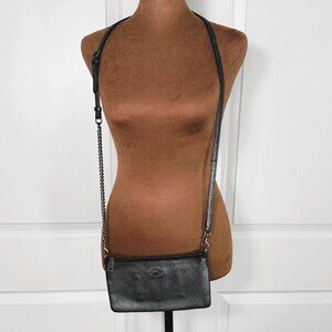 Burnished metallic leather and a gunmetal chain strap give this versatile little crossbody an industrial edge. Interior pockets and a zip-top closure keep essentials neatly and securely organized.