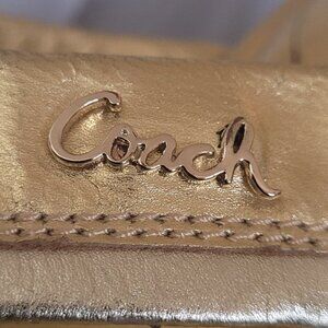 Shimmering gold sandals by Coach. Stylish and comfortable for any event.