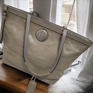 Stylish Coach tote in metallic gray. Features signature logo and sleek design. Ideal for daily use.