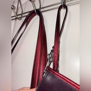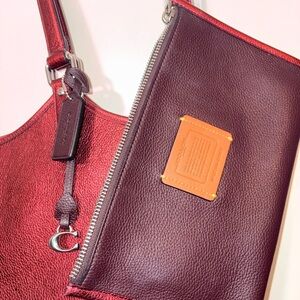 Keywords: Coach Metallic Berry Day Tote, C0869, Metallic Pink Burgundy Leather, Designer Work Bag, Large Laptop Tote with Pouch, Authentic Coach Handbag.