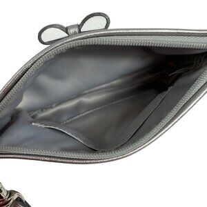 This Coach Metallic Silver Corner Zip Wristlet Clutch Wallet is a stylish accessory with a signature leather heart design. Perfect for carrying essentials securely, it combines elegance and functionality in a compact form.