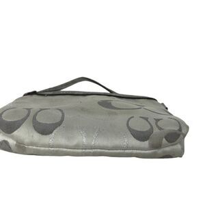 Iconic Coach monogram logo pattern with main zipper closure and leather wrist strap