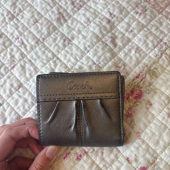 Elegant Coach wallet in metallic silver. Sleek and compact design.