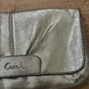Elegant metallic wristlet clutch by Coach. Features a sleek design with a wrist strap. Perfect for a night out.