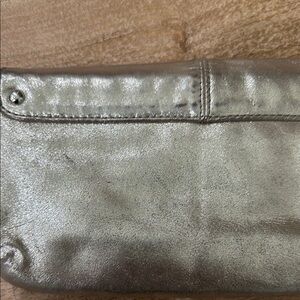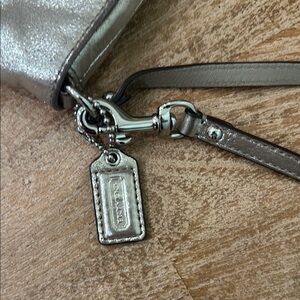 Elegant metallic wristlet clutch by Coach. Features a sleek design with a wrist strap. Perfect for a night out.