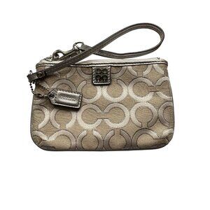Adorable Coach Wristlet in Tan with Metallic accents never been used. This item offers an interior pocket, leather wrist strap, signature Coach tag, and is constructed of cloth with a leather strap.