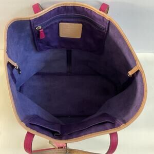 Gorgeous Coach tote in purple, pink and tan straps, tan trim.