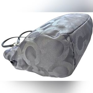 New with out tags! Discover the perfect blend of style and functionality with the Coach Gray Metallic Signature Tote Satchel. This elegant bag showcases Coach's iconic monogram pattern in a subtle gray tone, complemented by a lustrous metallic finish and silver tone hardware. Original hang tag, zip closure, slip pocket on exterior, and zip pocket in the interior. Timeless horse and carriage logo and interior color is maroon. Color may vary due to camera lighting. Unbranded gray dust bag included.
