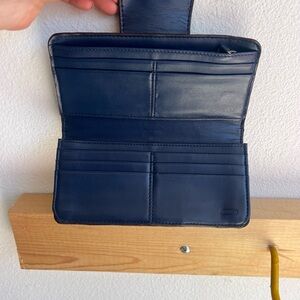 Elegant Coach wallet in glossy midnight blue. Features a refined design with a secure flap closure. Matching purse also available
