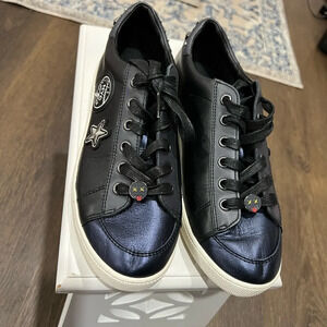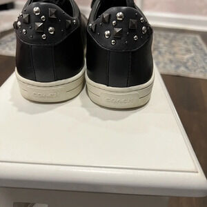 Coach Porter Lace Up Sneakers, Size 9. Gorgeous and like new! Coach Porter lace up sneakers. Black with trendy embroidery and metal detail. Such a unique, fun sneaker! Leather upper Cotton twill lining and footbed Rubber outsole Lace-up closure . COLOR BLACK/MIDNIGHT NAVY excellent condition no smell 😂 😆