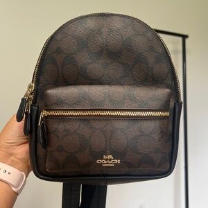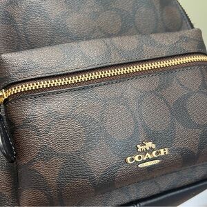 Like new!! Coach signature print mini leather backpack in classic brown and black. So cute and matches everything. Front small pocket for easy access to phone or wallet. Approximately 9 inches tall.