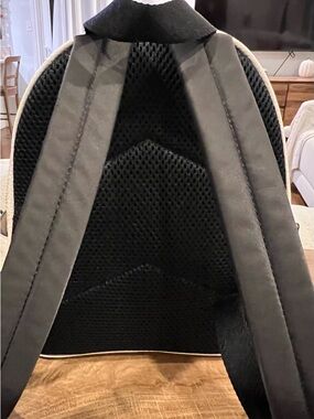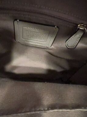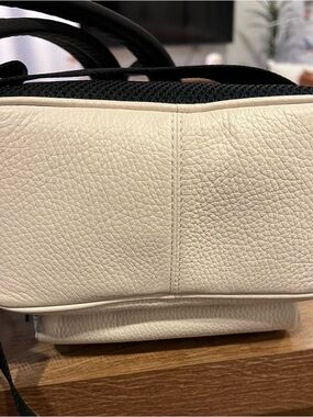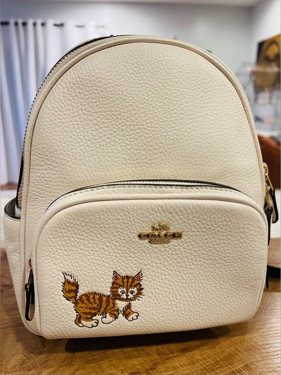 Compact Coach leather mini backpack. Cream pebble leather with cute cat patch. Gold hardware and logo on front. Structured silhouette and front zip pocket. Stylish and playful everyday bag.