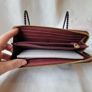 The Long Zip Around Wallet is printed coated canvas and smooth leather. It has twelve card slots, full-length bill compartments and an inside zip coin pocket. It measures 7.25" (L) x 4" (H) x 1" (W)