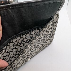 Stylish Coach wristlet in black and gray. Features signature pattern and secure clasp.
