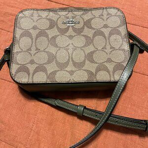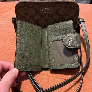 Signature Coated Canvas and Smooth Leather. Adjustable strap with 23" drop for shoulder or crossbody wear.7 1/4" (L) x 5 1/4" (H) x 2" (W)